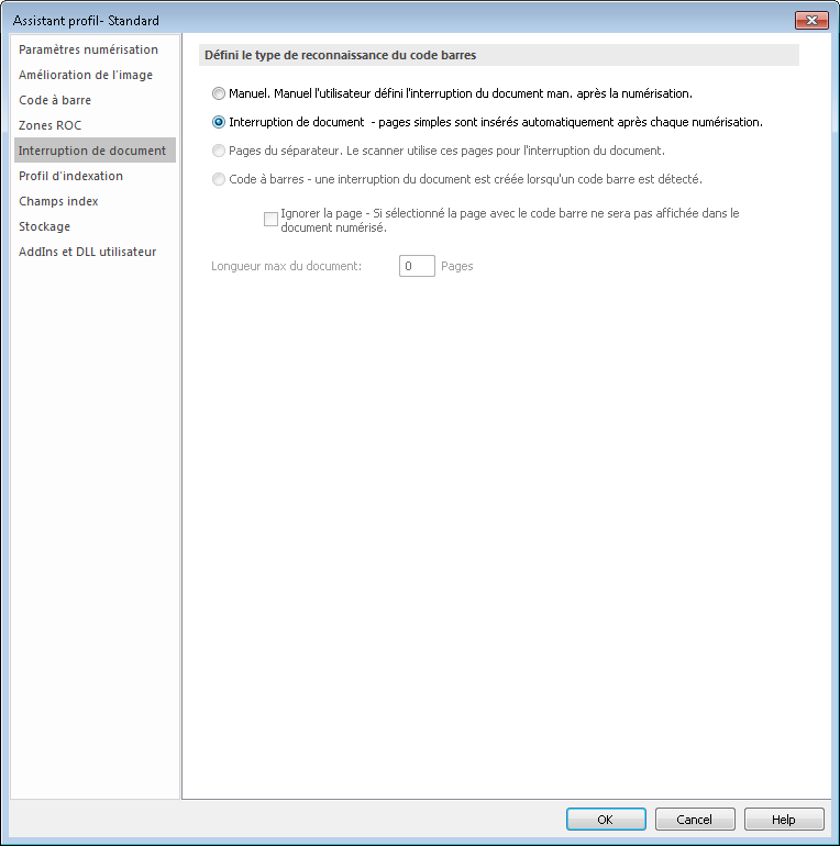 6.Vous devez ensuite spécifier le mode d'identification des interruptions de document. Notez que ces paramètres seront utilisés en conjonction avec toute interruption définie dans Zones ROC.