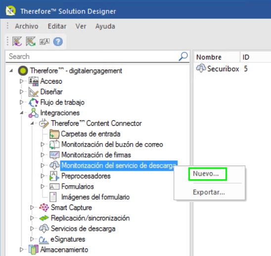 5.El siguiente paso consiste en crear un nuevo origen de Content Connector. En Therefore™ Solution Designer, vaya a Integraciones > Therefore™ Content Connector > haga clic con el botón derecho en Monitorización del servicio de descarga y seleccione 'Nuevo...'.