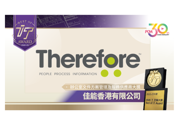 Therefore™ has won an award! This time, we are being honored by PCM, a 30 year old, professional technology magazine based out of Hong Kong. The award was presented to Canon Hong Kong Limited in recognition of Therefore™ information management system.