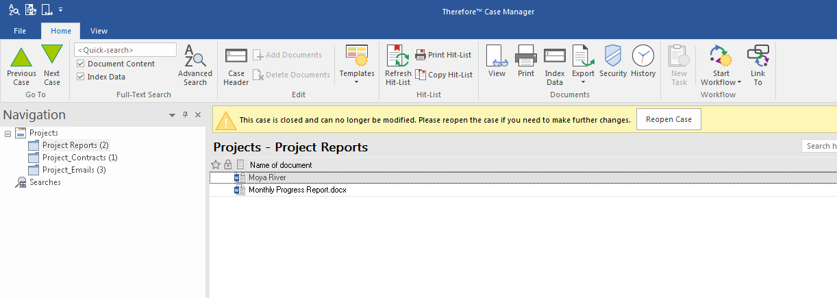 2.Nachdem eine Akte geschlossen wurde, erscheint eine Benachrichtigungsleiste über der Dokument-Trefferliste. Über diese Leiste können Administratoren die Akte wieder eröffnen.