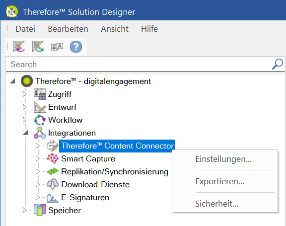 Durch Rechtsklicken auf das Therefore™ Content Connector-Objekt wird ein Kontextmenü geöffnet. Mit einem Doppelklick wird der Therefore™ Content Connector-Administrator geöffnet.