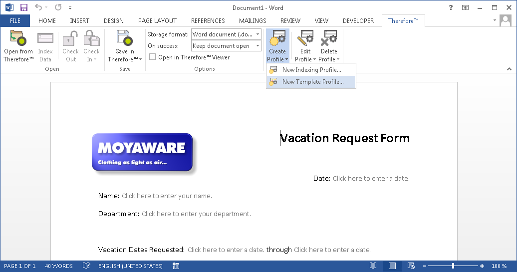 1.Öffnen Sie die Microsoft Office-Vorlage, z. B. eine Microsoft Word-Vorlage. Klicken Sie im Menü auf die Registerkarte "Therefore™". Wählen Sie unter Profil erstellen die Option Neues Vorlagenprofil aus.