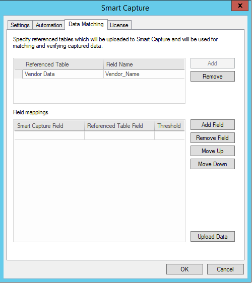 5. Seleccione un campo de Smart Capture y un Campo de tabla referenciada para asociar estos campos. Establezca un porcentaje de coincidencia para este campo en Umbral.