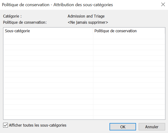 Toutes les sous-catégories sont recensées et la politique de conservation peut être réglée sur <Ne jamais supprimer> ou être affectée à une autre politique de conservation. En pratique, cela signifie que les documents contenant cette valeur d'index sont affectés à la nouvelle politique de conservation.