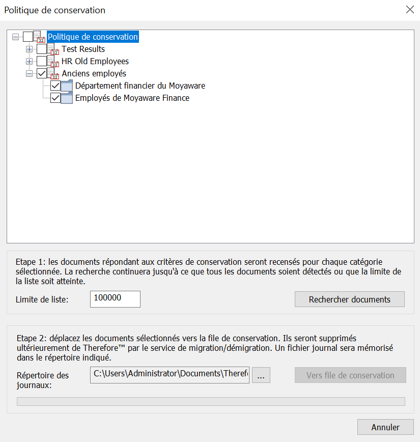 6.La boîte de dialogue Politique de conservation s'ouvre. Cochez la case en regard de la politique ou des catégories d'une politique et cliquez sur « Rechercher documents ».