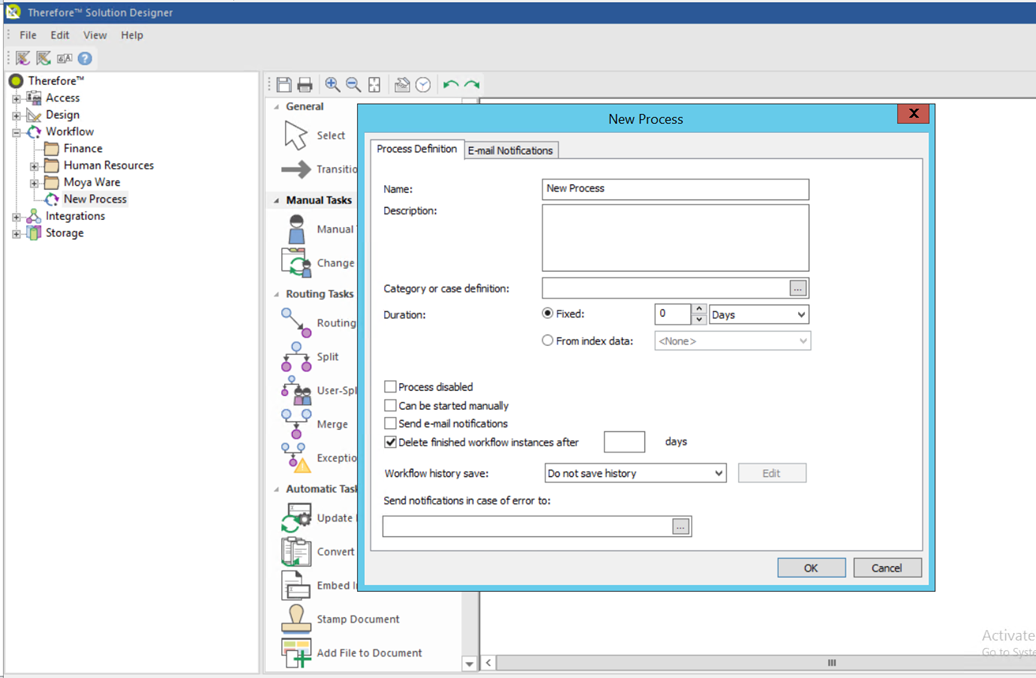4. Entrez les données relatives au nouveau processus. Cochez la case « Effacer instances terminées workflow ap. ...jours » pour déverrouiller les diverses options associées à « 'Mémoriser historique du workflow dans ».