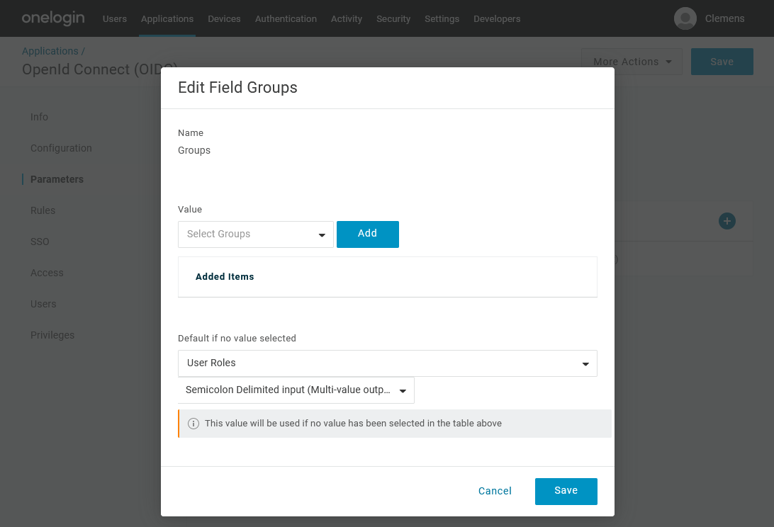 6. Im Abschnitt Parameter wird bereits das Feld Groups (Gruppen) angezeigt. Dies muss jedoch so angepasst werden, dass es Rollen anstelle von Gruppen zurückgibt.