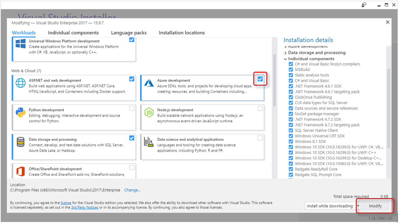 Öffnen Sie die Registerkarte "Workloads" und suchen Sie nach "Azure development". Aktivieren Sie das Kontrollkästchen oben rechts und klicken Sie auf "Modify", um die Änderungen anzuwenden.