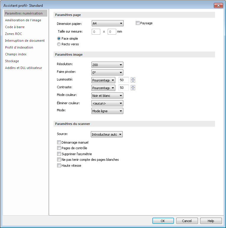 2.L'assistant profil s'ouvre à la première page, Paramètres numérisation. Ces paramètres sont automatiquement appliqués quel que soit le scanner utilisé pour numériser le document. Configurez-les en fonction de vos besoins.