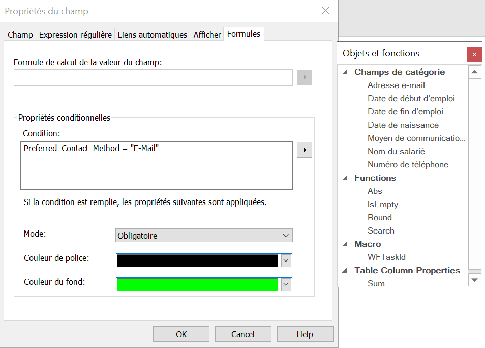 3.Pour les champs qui seront automatiquement calculés, cliquez dessus avec le bouton droit de la souris, sélectionnez « Propriétés », puis accédez à l'onglet « Formules ». Entrez la formule de calcul de la valeur du champ appropriée. Développez la zone en cliquant sur la flèche pour afficher les fonctions et champs de catégorie disponibles. Entrez manuellement n'importe quel opérateur arithmétique standard : ajouter (+), soustraire (-), multiplier (*), diviser (/), élever à une puissance (^). Le calcul automatique respecte l'ordre mathématique standard des opérations. Dans cet exemple, la formule définie pour calculer une taxe de 20 % est « Invoice_Amount_net * 0,2 », tandis que la formule de calcul du montant total TTC de la facture est « Invoice_Amount_net + Tax ».