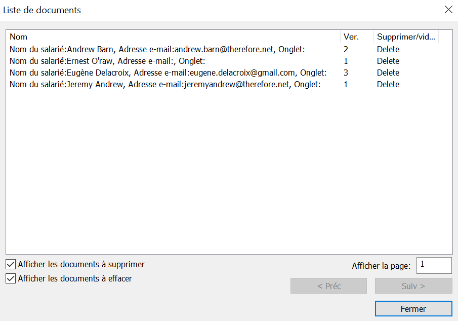 8.Si vous décidez de ne pas supprimer un document de la liste, cliquez dessus avec le bouton droit de la souris et sélectionnez « Enlever de la liste de suppression ». Lorsque la liste de documents à supprimer vous convient, fermez cette fenêtre et cliquez sur « Vers file de conservation » dans la fenêtre Politique de conservation (voir ci-dessus).