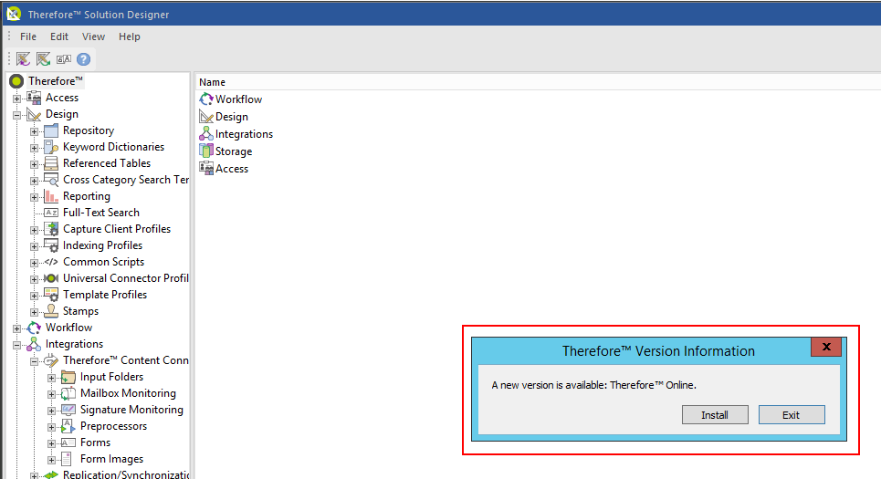 1.Pour disposer des nouvelles fonctionnalités, vous devez obligatoirement mettre à niveau Therefore™ Solution Designer. Lorsqu'une nouvelle version du client est disponible, une fenêtre contextuelle s'affiche à l'ouverture de Solution Designer. Cliquez sur Installer pour démarrer le processus de mise à niveau.