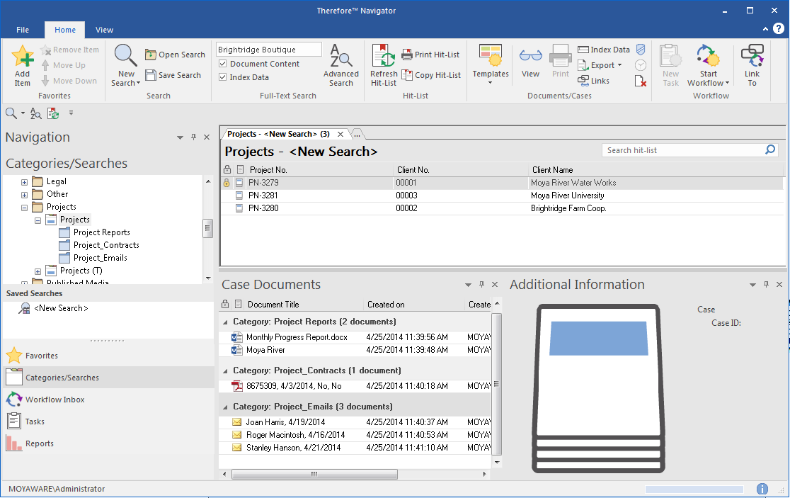 3.Nella hit-list vengono elencati tutti i fascicoli che corrispondono ai criteri della ricerca. Il riquadro Documenti di fascicolo mostra un elenco delle categorie e dei documenti nel fascicolo. Si può aprire un fascicolo intero facendo doppio clic sul fascicolo nella hit-list, o si può aprire un solo documento facendo doppio clic sul documento stesso.