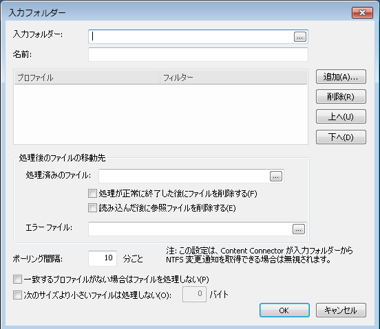 | 処理済みのファイル:処理が正常に終了した後にファイルを削除する がチェックされていない場合は、処理が完了したファイルはこのフォルダーに移動されます。 |